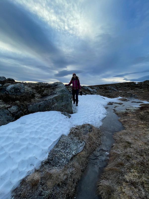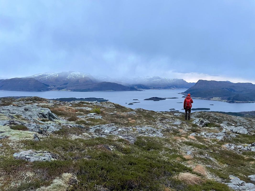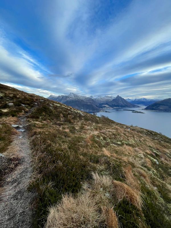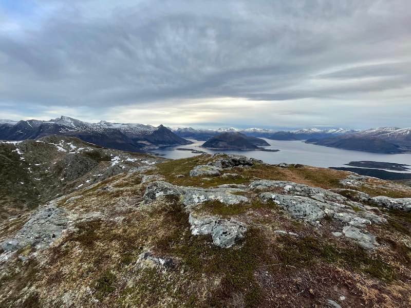 Kurz vor dem Top kommt sogar der erste Wanderer in diesem Jahr entgegen. Die Sonne wird bald untergehen. Eine Weite und Vielfältigkeit eröffnet sich oben auf dem Berg. Am Horizont verschneite Berge und das Meer getaucht in eine Abendfärbung.