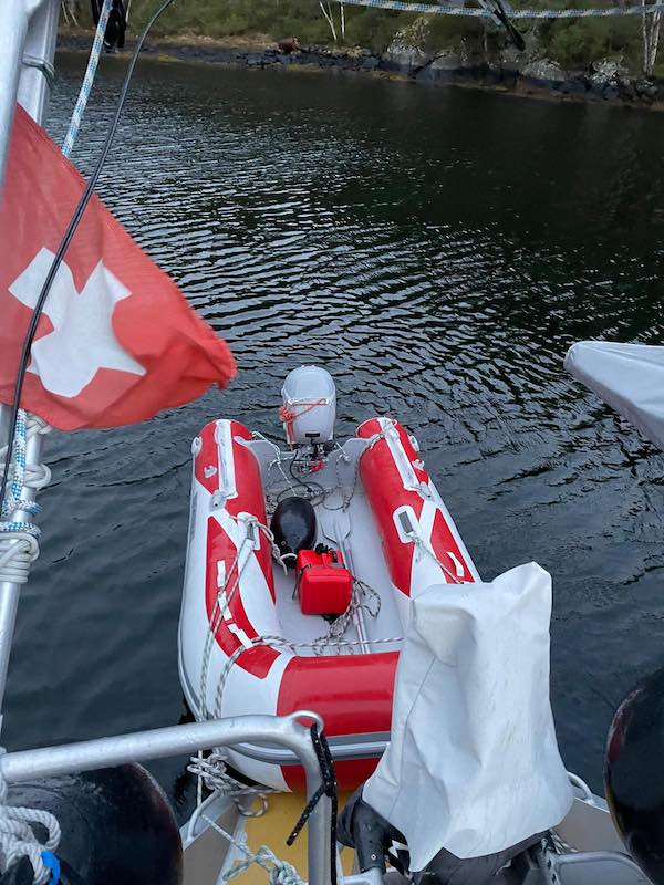 In einer Hagel- und Windpause suche ich den Weg nach draussen für die geplante Dusche. Die Badeplattform ist von unserem Beiboot, Mr. Wombat, besetzt. Damit er seine Stabilität auch in den Windböen behält, ist er mit der Schnauze auf die Badeplattform geschnallt um zu verhindern, dass er das fliegen lernt.
