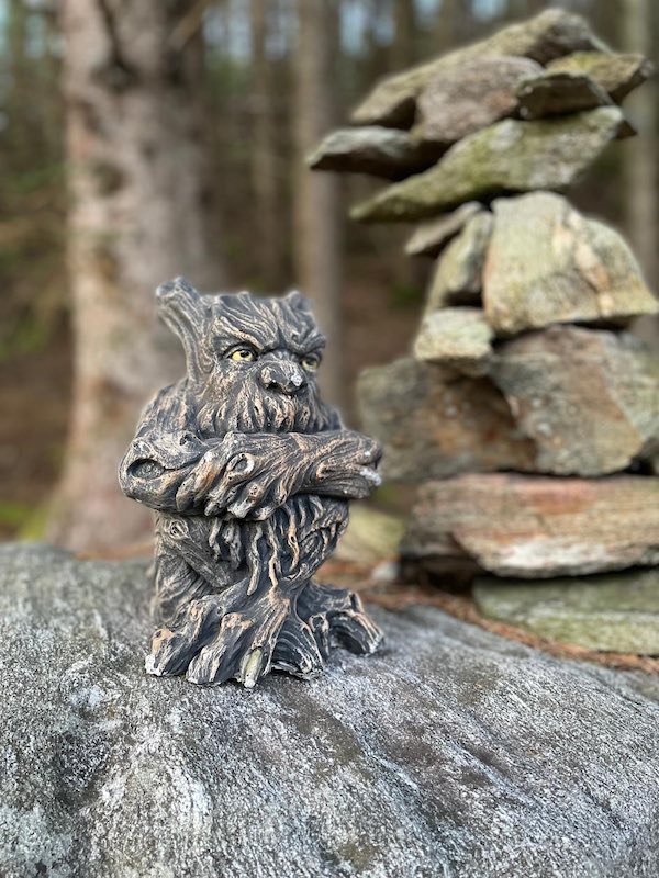 Oben angekommen ist klar, dies ist kein Ort zum Tee trinken und Pistazien knabbern. Es gibt keine Aussicht auf dem flachen, bewaldeten Gipfel und eine Antenne markiert summend ihre Präsenz. So geht es wieder ein Stück zurück, auf einem Stein, gut positioniert mit Aussicht in die Schneeberge und der Sonne im Gesicht. Unsere Füsse gehen einen anderen Weg entlang bis zu dessen Ende. Ein liebevoll, gepflegtes Grundstück mit auffällig vielen Tonfiguren. Und siehe da, auch hier geht ein sehr alter, steinerner Pfad weiter über die Wiese und in den Wald zu einem Gnom.
